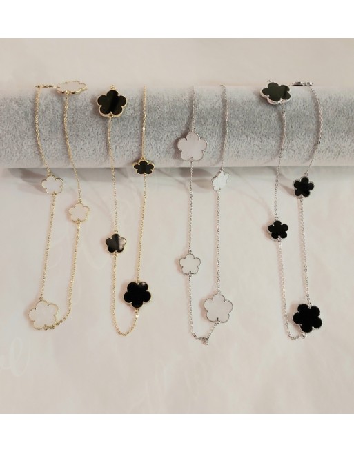 Sautoir raffiné et très féminin avec 5 fleurs en 2 tailles différentes. Le contour est travaillée en pointillé. Les fleurs ont 5 pétales. Existe en 4 déclinaisons. Acier inoxydable. Résiste à l'eau et aucune allergie.