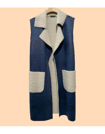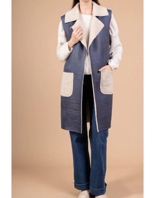 Gilet long longueur genou en faux mouton retourné. Sans manches, double col et deux granges poches appliquées. Beige/écru ou jean/écru, taille unique.