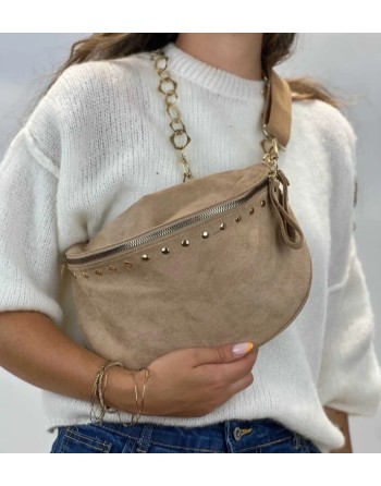 Très tendance la banane s'inscrit dans les must have de cette saison. Celle-ci est travaillée avec des détails cloutés dorés. Une fermeture éclair en ouverture et une large bandoulière amovible. Un compartiment zippé dans l'arrière.