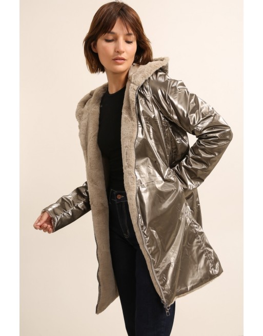 Cette veste outdoor coche toutes les cases: coupe-vent, imperméable, chaude, stylée et REVERSIBLE. Extérieur couleur bronze brillant et l'intérieur en fausse fourrure. 2 poches invisibles recto et verso. 4 tailles.