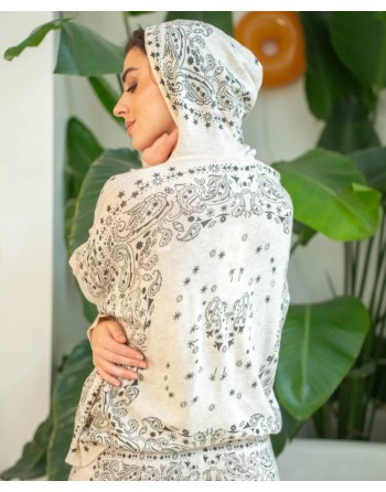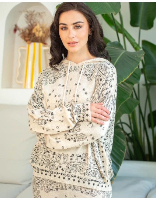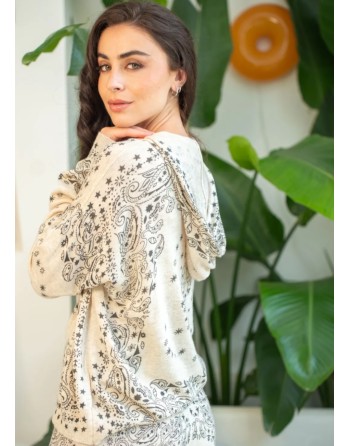 Pull à capuche en maille fin dans un imprimé bandana très tendance. Fond écru, dessin marron.