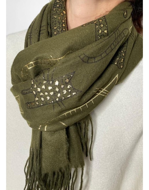 Echarpe kaki très douce dans un format 70x180 avec des franges aux extrémités et un dessin noir et doré représentant des chats très tendance.