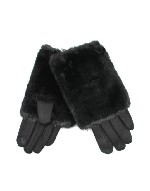 Gants tactiles noirs en faux daim fourrés avec une fine polaire chaude. Par dessus des mitaines en fausse fourrure pour un look montagne chic.