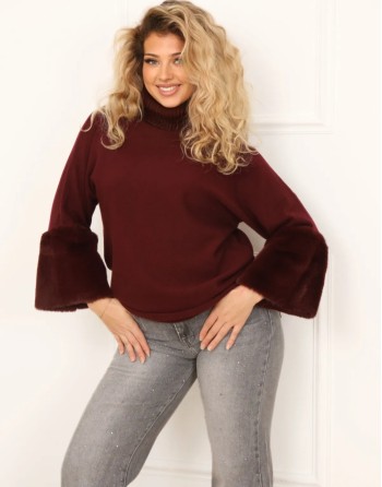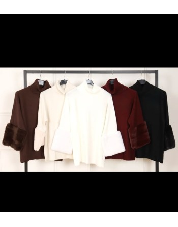Pull original et cozy décliné en écru et chocolat taille unique. Col roulé large, coupe loose et assez long avec des manches chauve-souris qui se terminent par un large bord en fausse fourrure.