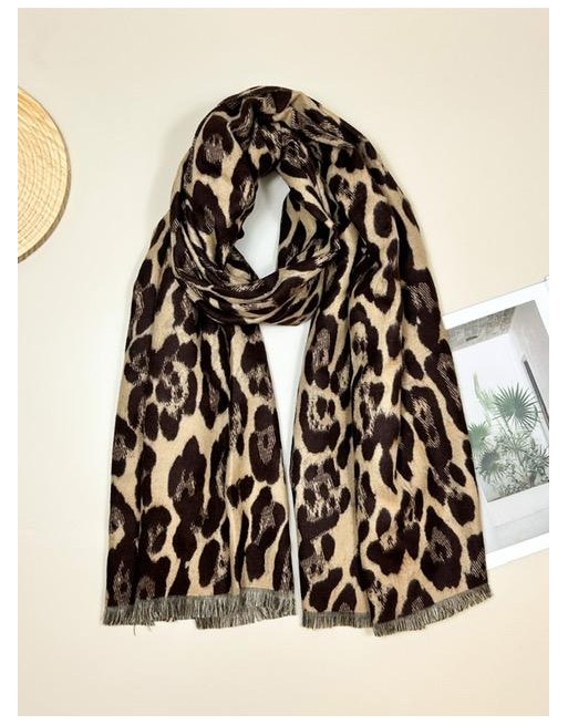 Echarpe au motif léopard marron et beige avec de courtes franges aux extrémités. Douce et chaude dans un mélange de nobles matières.