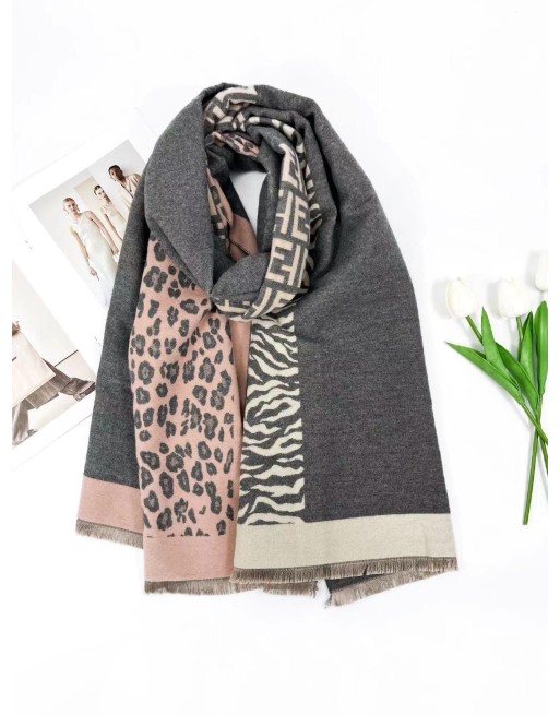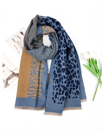 Echarpe rectangulaire chaude dans un très beau mélange de matières et imprimés. Rose/gris et marine/indigo.