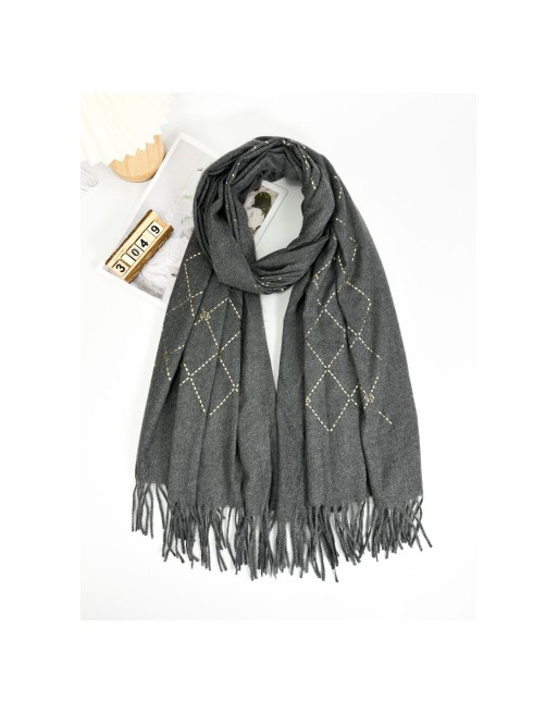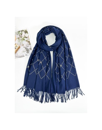 Echarpe très douce en marine ou gris avec des losanges en fil doré. Des finitions avec franges aux extrémités. Rectangulaire.