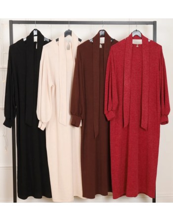 La robe Mabel en matière chaude et fluide marie à la perfection le chic, la simplicité et le confort. Unie, large et fluide elle se porte volontiers avec sa ceinture ou avec une ceinture large colorée pour bien marquer la taille. Manches longues et un peu bouffantes vers le poignet. Convient très bien aussi pour les rondes à porter tout en souplesse sans ceinture. Noir et marron/rouille.