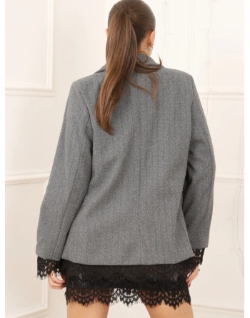 Veste en chevron gris et noir avec de la dentelle qui dépasse du bord en bas et des poignets. Double col et fermeture 1 bouton. Matière chaude et épaisse, taille unique.