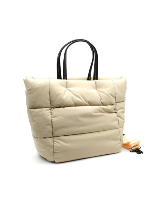 Sac en matière doudoune à grande capacité. Anses en simili cuir marron pour le porter au bras ou sur l'épaule et une large bandoulière amovible. Léger et spacieux.