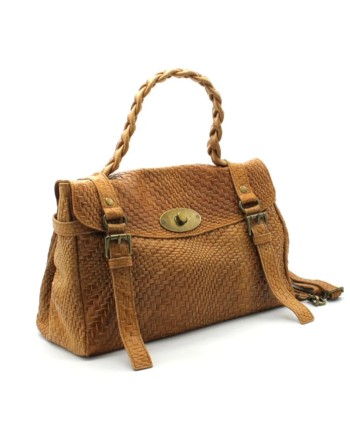 Magnifique sac en cuir travaillé façon tissage avec des détails métalliques. Anses tressée. A rabat avec un fermoir tournant et une fermeture zippée en dessous. Bandoulière amovible.