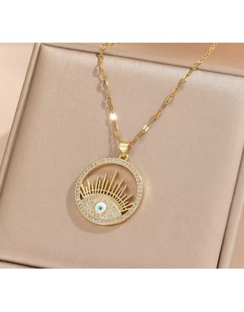 Raffiné en acier inoxydable doré avec un pendentif soit en forme ronde avec des brillants ou en forme d'oeil avec des brillants colorés.