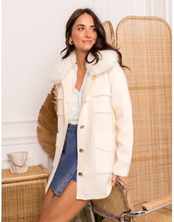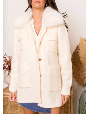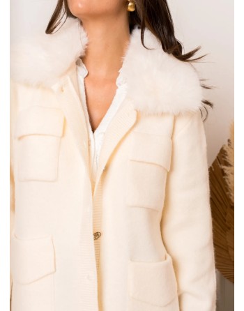 Veste en matière stretch légèrement oversize avec un magnifique col en fausse fourrure amovible par des boutons. Ecrue avec des boutons bijoux et 4 poches appliquées. Taille unique, convient aussi pour les silhouettes plus rondes.