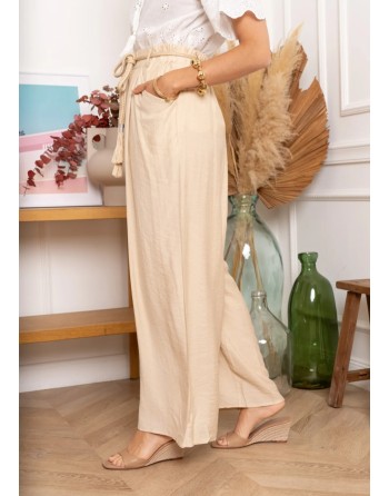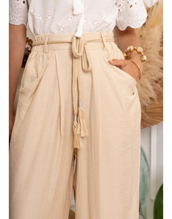 Pantalon large, fluide et léger en beige et noir. Taille plutôt haute agrémentée d'une ceinture en cordon torsadé. Poches latérales. Très agréable et facile à porter. 3 tailles.