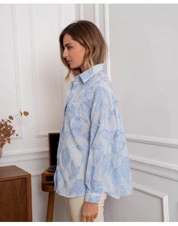 Chemise rayée en coton avec un imprimé  floral ton sur ton. Boutonnage classique, assez longue et avec des manches longues que l'on peut fixer aux coudes. Disponible en 3 tailles.