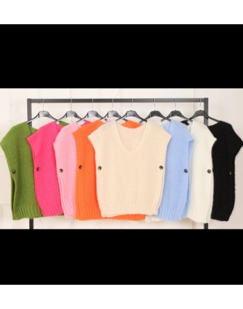 Gilet en maille avec un aspect mohair, oversize, avec un col en V et ouvert des côtés et un bouton sous l'emmanchure. Taille unique, il se porte sur un chemisier ou sous-pull près du corps. La pièce très tendance de cette entrée de saison.