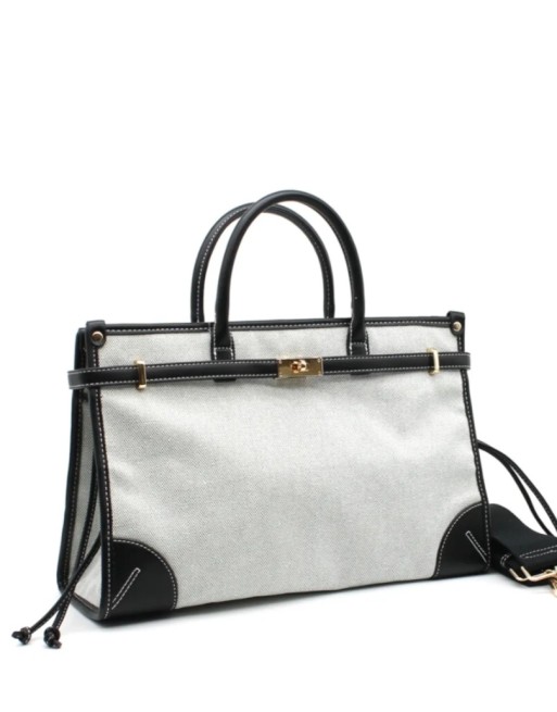 Sac à main en toile de coton avec des détails en simili cuir noir. Format moyen, une fermeture éclair et une large bandoulière amovible. Modèle chic et intemporel.