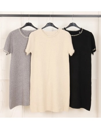 Ultra féminine la petite robe en maille stretch à manches courtes. Longueur au-dessus du genou et une encolure ronde. L'encolure et les manches sont ornés par des perles blanches. Confortable, facile et féminine.