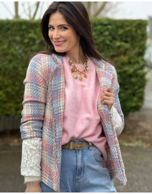 Veste à carreaux dans de tons printaniers pastels très doux. Non doublée et sans fermeture elle se glisse sur n'importe quel top, chemisier ou tshirt. Des finitions avec de courtes franges autour du col châle.