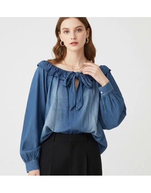 Tunique en matière tencel couleur denim stone. Manches longues bouffantes avec poignet et un col que élastiqué que l'on peut porter en forme bateau ou en libérant les épaules. Frou frou et une attache à nouer.
