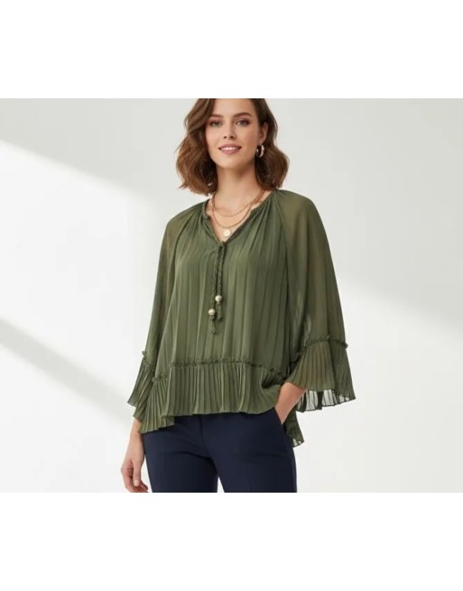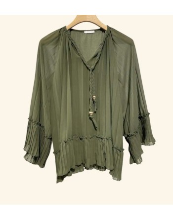Très jolie tunique en mousseline plissée. Manches larges transparentes, le buste est doublé devant et derrière. Un décolleté en V bordé d'un cordon tressé décoratif. Kaki ou noir, taille unique. Coupe ample et vaporeuse pour toutes les silhouettes.
