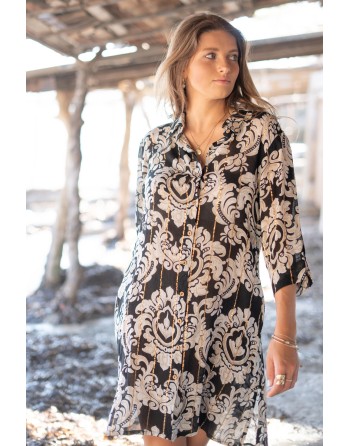 Robe ou tunique longueur genou avec une manches 3/4. Imprimé fleuri noir ou beige avec un fil lurex doré. Mousseline légèrement transparente avec deux poches latérales. Sublime sur un maillot de bain, ouverte sur un short ou en robe boutonnée.