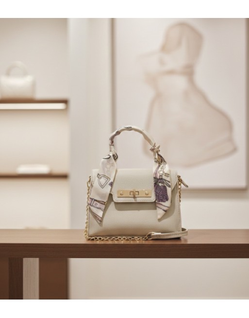 Les mini sacs sont just so trendy! Celui-ci est ravissant en cuir végane beige avec un foulard qui entoure la anse. Fermoir à tourner et une bandoulière en chaînette dorée amovible. Aussi bien la journée qu'en soirée.