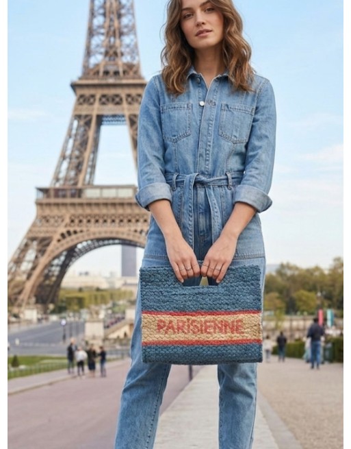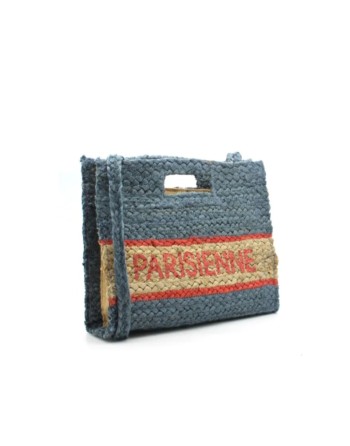 Pochette en jute tressée avec une écriture "Parisienne" sur une face. Poignée et une bandoulière non amovible. Fermeture éclair.