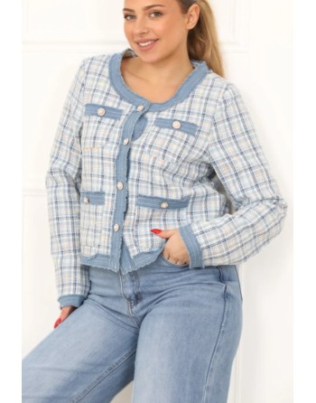 Veste à carreaux style "Chanel" courte avec des détails en jeans. Col rond, de jolies boutons dorés et 4 fausses poches appliquées. Déclinée en 3 tailles.