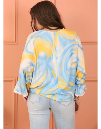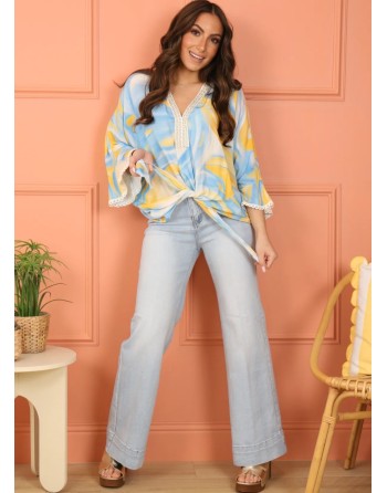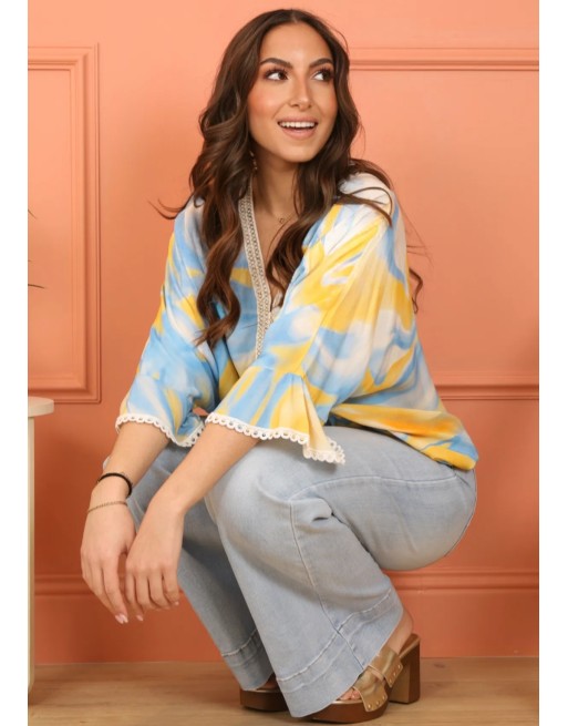Tunique fluide imprimée à nouer avec une manche 3/4 trompette. Décolleté en V travaillé en broderie. Matière viscose légère et agréable. 2 tailles.