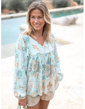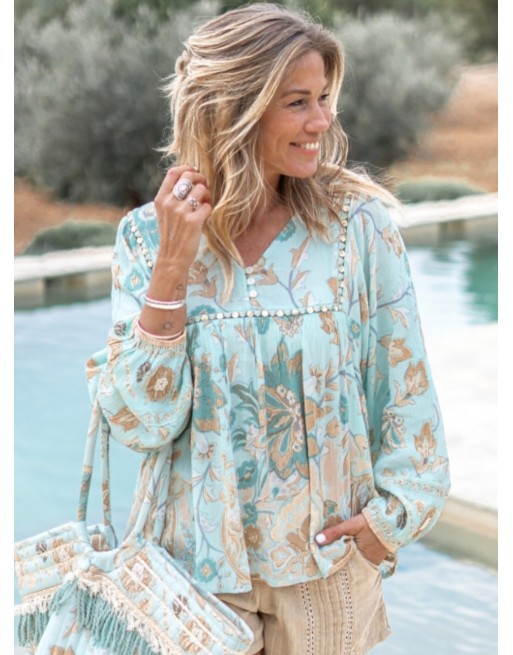 Magnifique tunique couleur aqua style bohème chic: brand IBZMode. Manches longues bouffantes, décolleté en V et un sublime imprimé floral aqua et beige. Légère, ample et fluide.