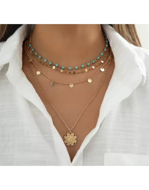 Collier fantaisie en acier inoxydable doré et pierres turquoises et des pastilles plates en 4 rangs. Peut être porté en 4 rangs réunis ou séparément. Pendentif rond forme mandala.