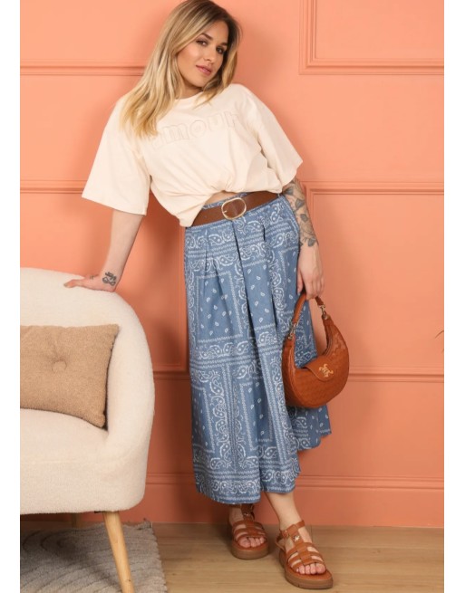 Jupe mi-longue en coton denim clair imprimé Bandana. Non doublée, elle vient avec une ceinture camel. taille élastiquée dans le dos et 2 poches latérales. Stylée et confortable.