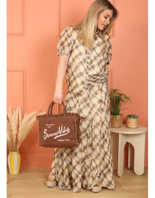Jupe longue féminine et vaporeuse dans un imprimé dans les tons vanille et brun clair. Elle pose très bien au niveau du ventre grâce à son drapée et sa taille élastiquée dans le dos. Disponible en 3 tailles.