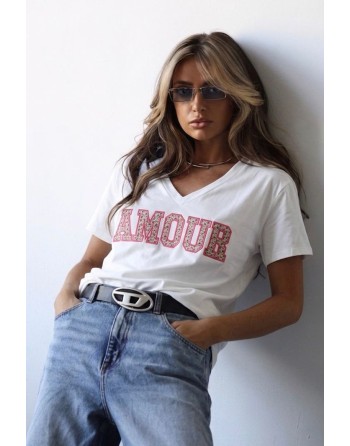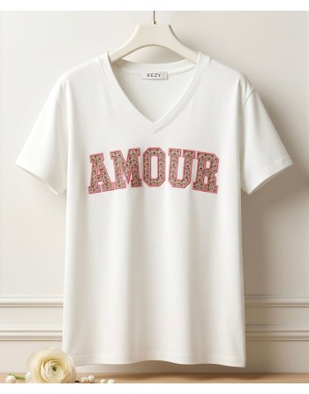 Teeshirt avec inscription "Amour" sur le devant. Coton stretch très confortable, manches courtes et encolure en V. Rose et blanc, taille unique.