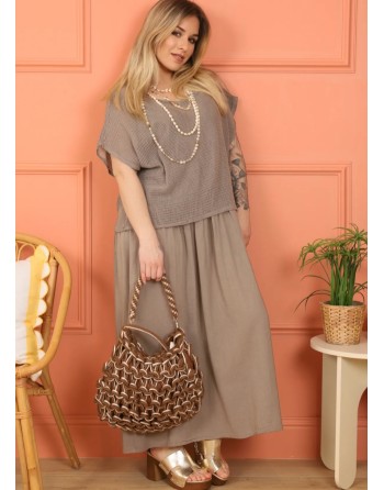 Robe aux allures minimalistes très simple en coton 2 et 1: robe débardeur avec un buste stretch, bas en coton souple et pardessus un pull manches courtes en filet fixé aux épaules. 3 couleurs, 1 seule taille. A porter avec une sandale plate ou plus rock n roll avec une botte cowboy.
