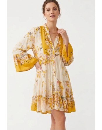 Robe fluide en viscose avec une longueur genou. Décolleté en V, manches longues avec un volant au bout. Travaillée évasée à "étages" dans un imprimé floral très doux soit en jaune ou rose pâle. Taille unique, très vaporeuse en coupe.